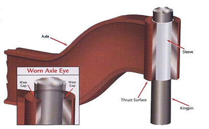Loose king pins can cause excessive tire wear. Axle Doctors™ patented axle eye